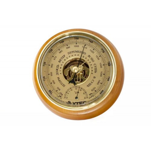 Корпус барометра изготовлен из натурального дерева (береза) и тонирован темным цветом. Все механизмы барометра выполнены из металлов, которые не подвергаются коррозии, поэтому изделие имеет расчётный срок службы на протяжении 10-ти лет. На циферблате барометра имеется две шкалы, по которым пользователи могут определить величину показаний как в миллиметрах ртутного столба, так и в гектопаскалях. Также следует отметить, что бытовой барометр имеет дополнительную шкалу для отображения показаний температуры окружающего воздуха в помещении. Диапазон измерения температуры: от - 10 до +50 °С.
