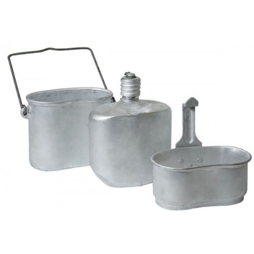 В комплекте присутствуют: фляга (объем 1 литр при весе в 220 гр), котелок (с прямоугольной дужкой, которая используется для подвешивания и переноса, емкость изделия 1 литр, а вес 200 гр), миска-подкотельник с ручкой-фиксатором (вес 40 гр, объем 0,5 литра).