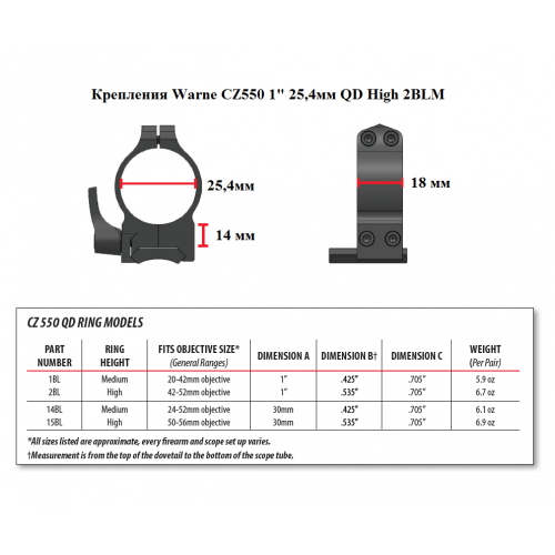 Технические характеристики быстросъемных креплений Wаrnе прицелов 1” для СZ550 (2ВLМ QD)