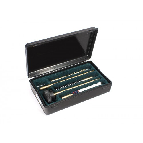 Комплект: латунный шомпол(разборный),щетинный ершик,щетинный металлический ершик и пуховик.