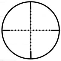 4. Прицельная сетка Mil-Dot с возможностью определения дистанции. Этот вариант сетки является наиболее распространенным на прицелах Leapers. Сетка Mil-Dot имеет большое перекрестие, пересекающее все поле прицела. В центральной части перекрестия через одинаковые интервалы нанесены многочисленные точки. Расстояние между двумя соседними точками при кратности увеличения 10х на расстоянии в 100 ярдов составляет 1 миллирадиан, или 3.44 МОА.
