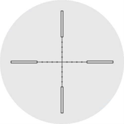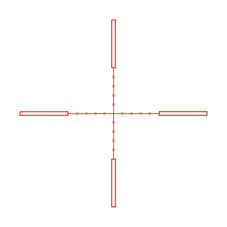 - MIL-DOT. Прицельная сетка не перегружена информацией. Точки и линии не закрывают цель, что позволяет более точно оценивать расстояние. Интервал между точками 1 мил (3.6" на 100 ярдов).