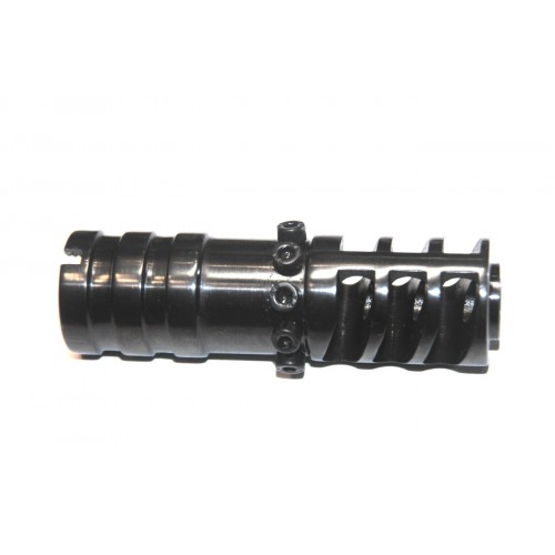 четыре камеры : три передних открытых камеры разработаны с углами для максимальной работы газа с целью уменьшения подброса вверх и вправо .Внутренняя камера имеет регулируемый газосброс ,что дает возможность регулировать увод оружия вверх и вправо (регулируется за счет открытия-закрытия пяти газосбросных отверстий винтами с шляпкой или утопленных установочных винтов (на выбор покупателя, по-ставляются в комплекте) установочные винты, рекомендуем после регулировки угла газосброса установить с фиксатором резьбы .В нижней части фрезерованная шлифованная площадка для удобной, быстрой установки - снятия шомпола, придающая пламегасителю " ФЕДЕРАЛ" свой неповторимый дизайн.