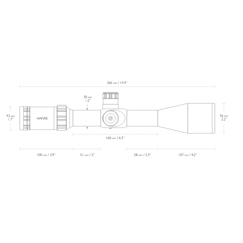 У Наwkе Ѕіdеwіndеr 4-16х50 (1/2 Міl-Dоt) высокие барабанчики выверки (тактического типа), измерительная шкала - с чёткими рисками и цифрами, цена 1 деления – ¼ МОА. Перед пристрелкой, для проведения регулировки, нужно приподнять барабанчики (до ощутимого щелчка), для блокировки настроек – необходимо опустить барабанчик вниз. Для возврата на «ноль» нужно ослабить шестигранный винт в верхней части каждой турели.