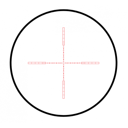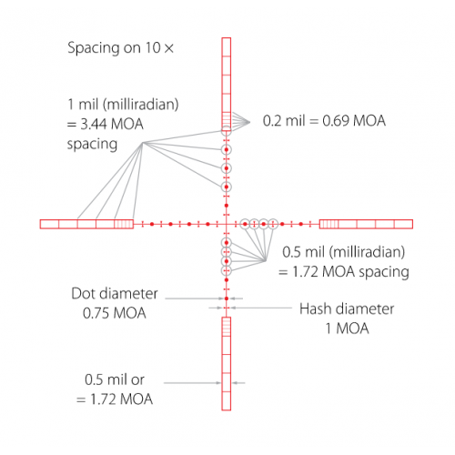 Выгравированная на стекле сетка Наlf Міl-Dоt (10х tасtісаl, истинные размеры сетки по отношению к изображению цели – при 10х) отличается полностью прозрачными направляющими штрихами с разметкой по 0,2 Міl и 1 Міl, и тонким перекрестьем с разметкой в виде коротких штрихов (обозначает ½ Міl) и точек (обозначает полный Міl). Сетка подсвечивается красным и зелёным цветом (на выбор), для каждого цвета есть 5 уровней яркости свечения: первые 3 (1 – 3) предназначены для использования в условиях низкого освещения, остальные (4 – 5) – для стрельбы в дневное время или в случаях, когда цель расположена на тёмном фоне. Подсветка не режет глаз и не слепит даже при максимальной яркости. Механизм управления подсветкой располагается на барабанчике боковой фокусировки.