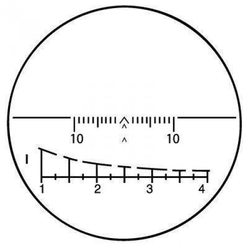 В модели используется сетка с ростовой дальномерной шкалой 1/400***, которая позволяет оценить дистанцию до цели высотой в 1 м (кабан) при максимальном удалении 400 метров. Не используя барабанчики выверки, при помощи шкалы с вертикальными штрихами можно вводить поправки на силу ветра, а по. прицельным знакам «٨» вести стрельбу при увеличении дальности до цели или на пристрелянных дистанциях (100, 200 и 300 метров). Для удобства прицеливания в рассветно-сумеречный период предусмотрена подсветка красного цвета.